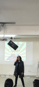 Pgdcp student showing the character that she dressed up for on freshers day.